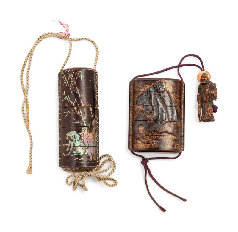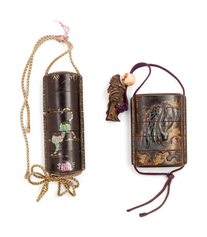 the first a gilt and black lacquer example, each side decorated with a vulture, together with a netsuke in the form of an elderly man; the second a mother-of-pearl inlaid black lacquer example.
