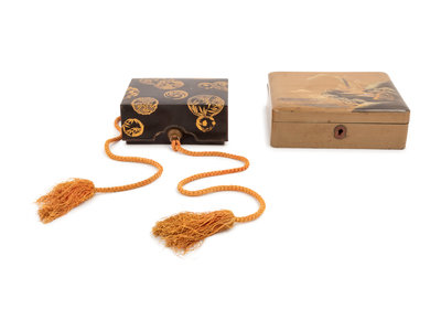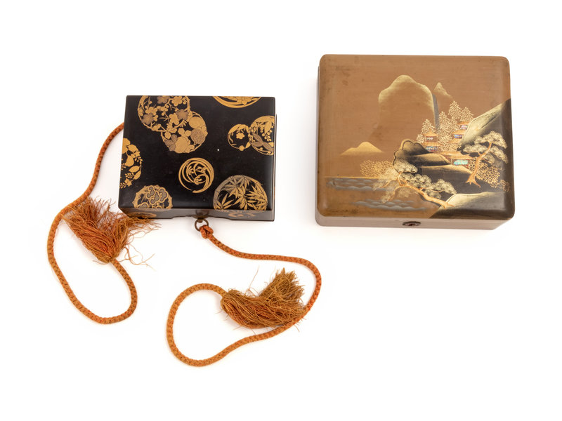 each of rectangular form, the first decorated with a landscape scene against a gilt lacquer ground; the second with gilt floral medallions above a black lacquer ground.