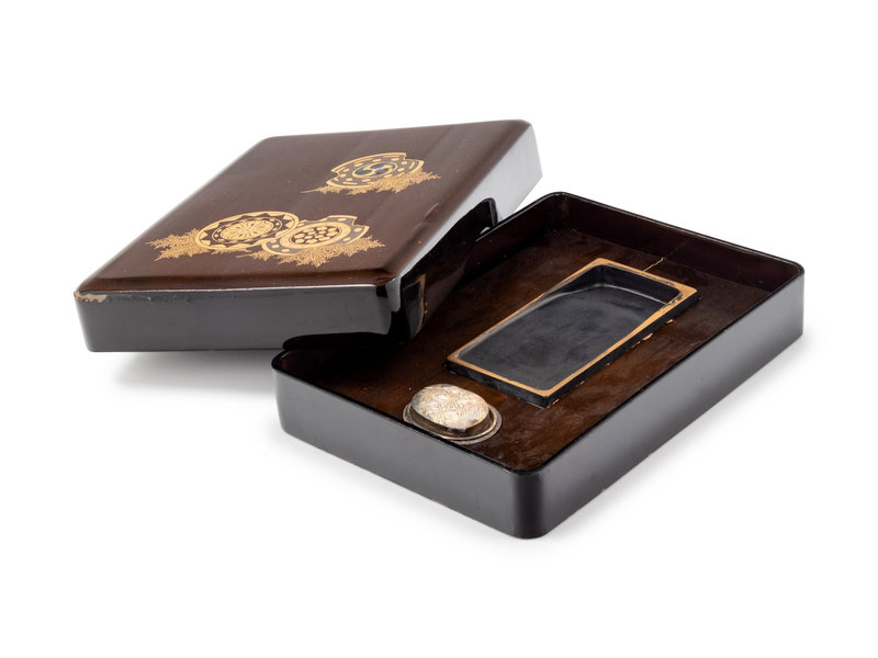 of rectangular form, the cover decorated with three gilt floral medallions above a black ground, containing a rectangular ink stone and a silver water dropper.