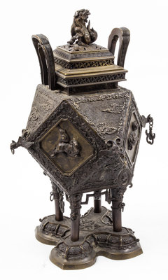 the body of faceted form decorated with fu lions, having a pair of upright handles and four bat form decorations suspending loose rings, supported on cylindrical feet, the rectangular cover surmounted by a seated shishi form finial.