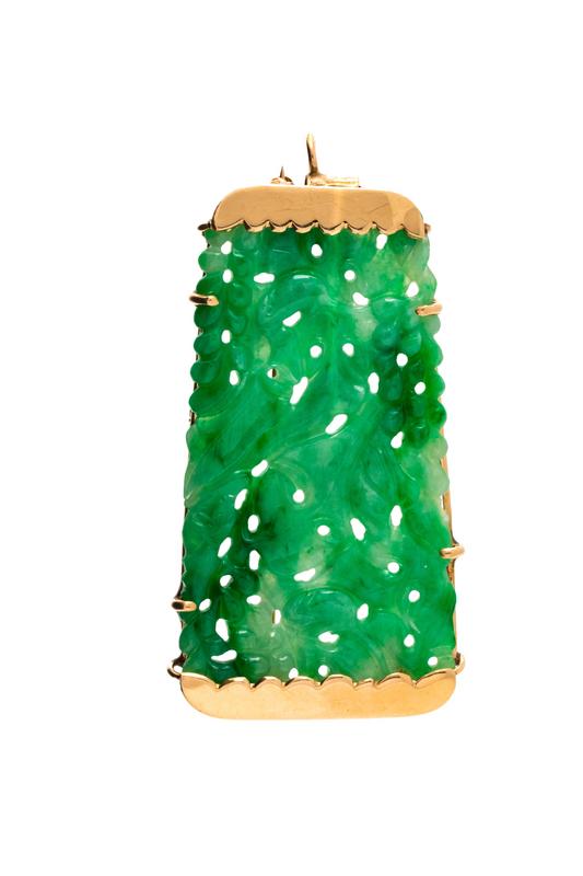 Containing one pierced and carved jade plaque measuring approximately 53.00 x 28.00 mm. Mounted in yellow gold.