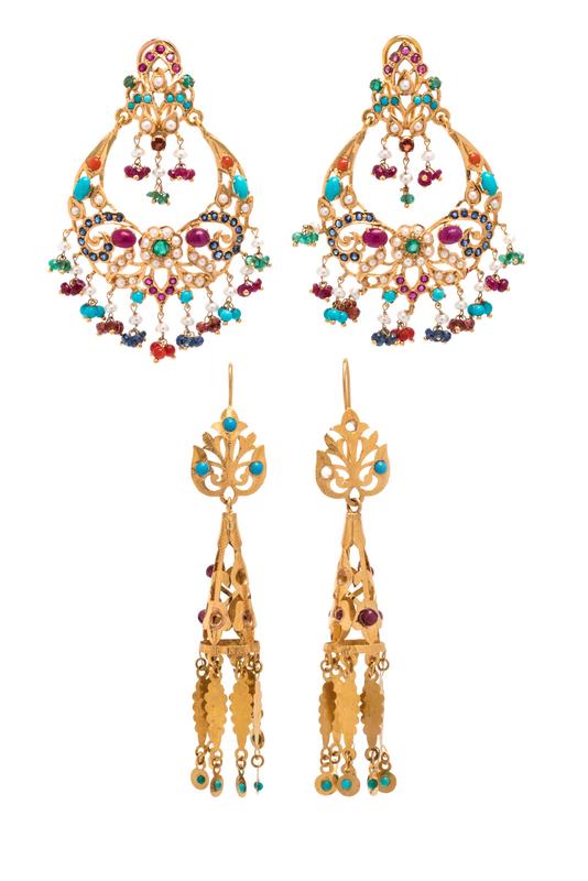 Consisting of a pair of yellow gold earrings containing numerous round, oval and rondelle gemstones including ruby, turquoise, emerald, coral and sapphire and numerous pearls, posts with clip backs, together with a pair of 21 karat yellow gold earrings containing numerous round cabochon cut turquoise and round garnet beads.