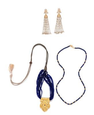 In Mughal style, consisting of a necklace with 24 karat gold central plaque containing one round mixed cut sapphire and foliate motif engraving, suspended from multistrand blue glass beads and braided cord, a necklace containing round lapis lazuli beads and high karat gold spacer beads, together with a pair of earrings containing numerous seed pearls.