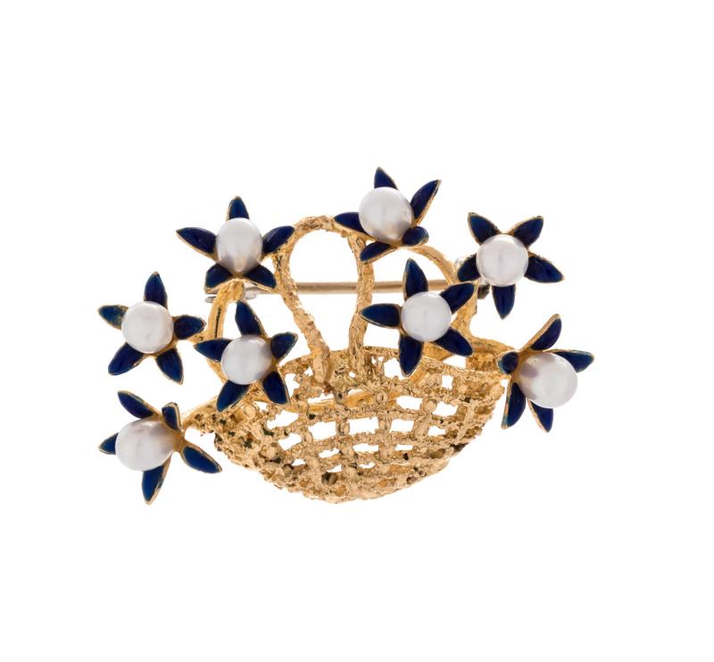 CULTURED PEARL AND ENAMEL FLOWER BASKET BROOCH