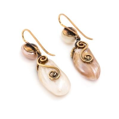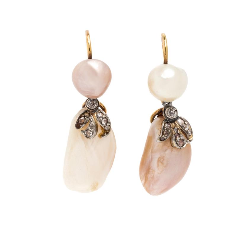 Consisting of two Baroque pearls, one pink and one white, measuring approximately 10.25 x 9.60 mm and 10.60 x 9.25 mm, two Baroque pearl drops, one pink and one white, measuring approximately 20.60 x 11.65 mm and 21.95 x 9.00 mm, and 20 old European and rose cut diamonds weighing approximately 0.20 carat total.