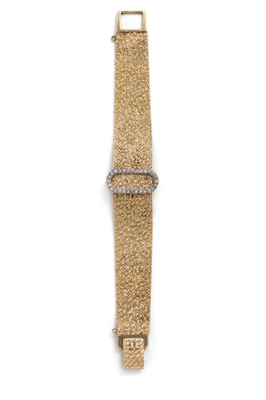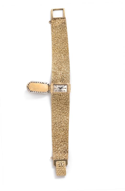 The hinged dial containing 28 single cut diamonds, 17.00 x 14.00 mm case dimensions, matte silvered dial signed OMEGA, applied gold and black baton hands, black baton hands, snap on case back, 17 jewel manual wind movement signed OMEGA WATCH Co, integrated textured gold bracelet