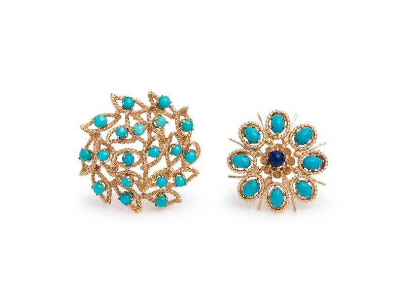 Consisting of a textured gold brooch containing 19 round cabochon cut turquoise measuring approximately 3.10-3.80 mm in diameter, together with a textured gold brooch containing one round cabochon cut lapis lazuli measuring approximately 4.70 mm in diameter and eight oval shape cabochon cut turquoise.