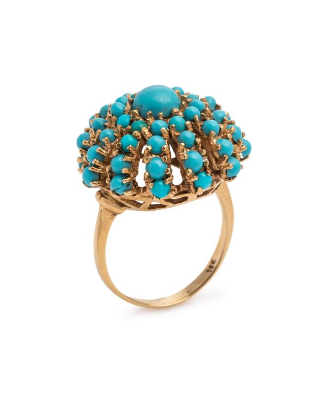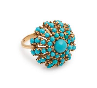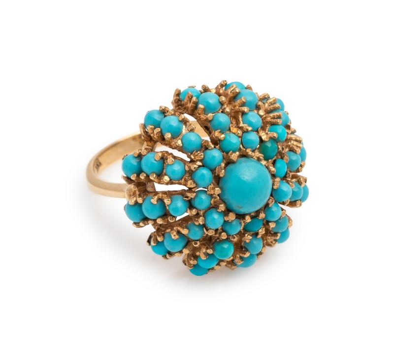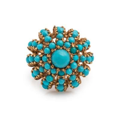 Containing one round cabochon cut turquoise measuring approximately 5.65 mm in diameter and numerous round cabochon cut turquoise measuring approximately 1.60-2.40 mm in diameter. Mounted in yellow gold.