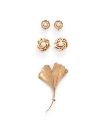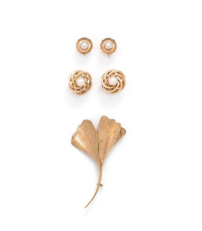 Consisting of a ginkgo leaf brooch by Oeke Weimar, a pair of earclips containing two cultured pearls measuring approximately 5.90 mm in diameter, together with a pair of earclips by F & F Felger containing two cultured pearls measuring approximately 6.90 mm in diameter.