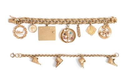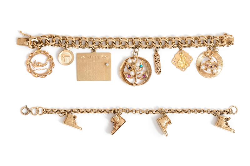 Consisting of a double rolo chain bracelet suspending four shoe charms, together with a fancy link bracelet suspending seven charms, including a 14 karat ballerina charm with six pearls, an 18 karat Italian saint charm, a 14 karat mezuzah charm, a leaf motif charm with three pearls and four gemstones, a calendar charm containing one diamond, a 14 karat chai charm and a boat motif charm.