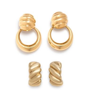 Consisting of a pair of 14 karat yellow gold shrimp style removable hoop earclips and a pair of 18 karat gold shrimp style earclips.