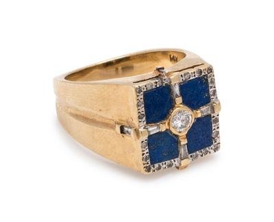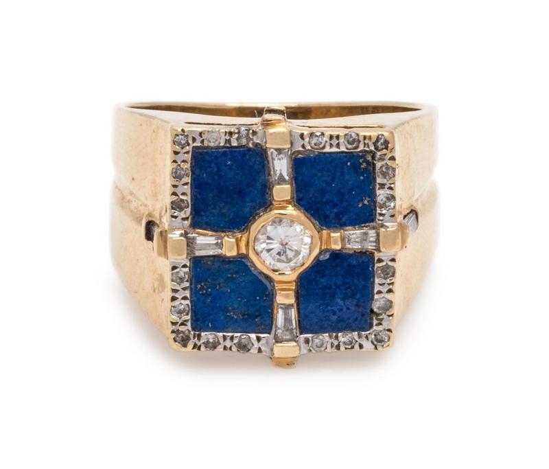 Containing one round brilliant cut diamond weighing approximately 0.15 carat, 20 round brilliant cut diamonds weighing approximately 0.06 carat total, eight tapered baguette cut diamonds weighing approximately 0.24 carat total and four lapis lazuli plaques. Mounted in yellow gold.