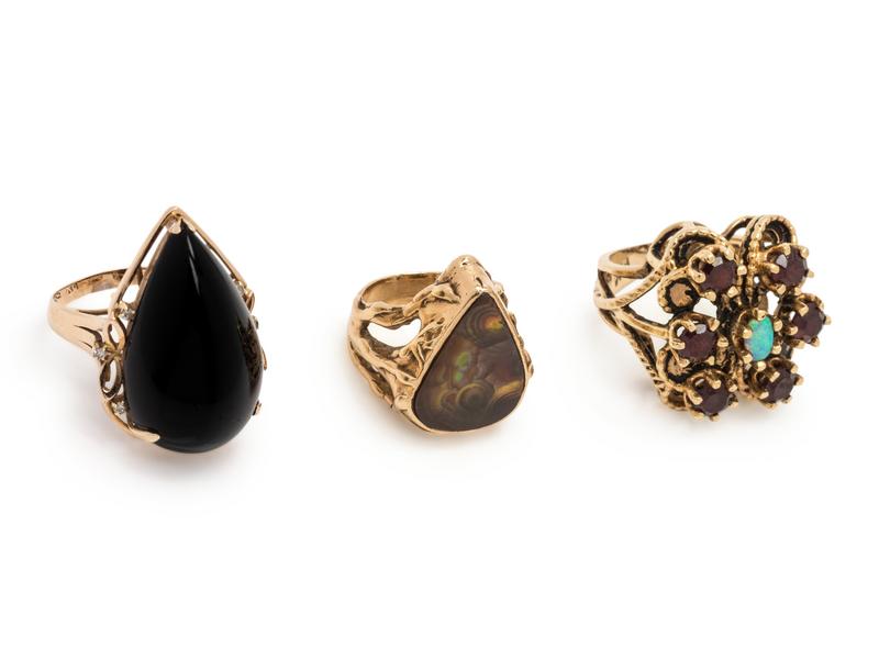 Consisting of a ring containing one oval shape cabochon cut opal and six round mixed cut garnets, a freeform ring containing one pear shape fire agate plaque, together with a ring containing one cabochon cut pear shape onyx and six round brilliant cut diamonds.