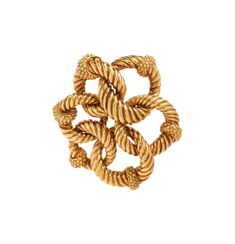 Consisting of six interlocking twisted gold rings.