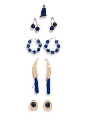 Consisting of a pair of hoop earrings containing alternating round lapis lazuli and yellow gold beads, a pendant containing one asymmetrical lapis lazuli, a pair of cable link chain earring enhancers containing four round lapis lazuli beads, a pair of stud earrings containing two oval shape cabochon cut lapiz lazuli, together with a pair of earrings containing two lapis lazuli drops.