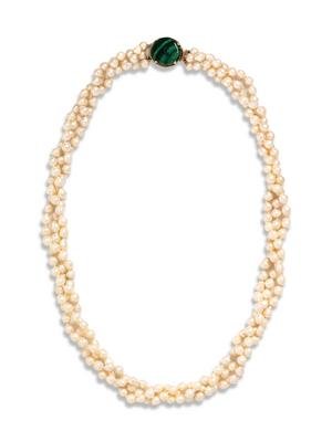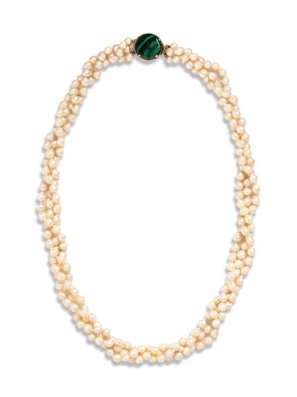 Consisting of three strands of freshwater pearls measuring approximately 7.00-8.00 mm in diameter with a yellow gold clasp containing one round malachite plaque measuring approximately 22.00 mm in diameter.