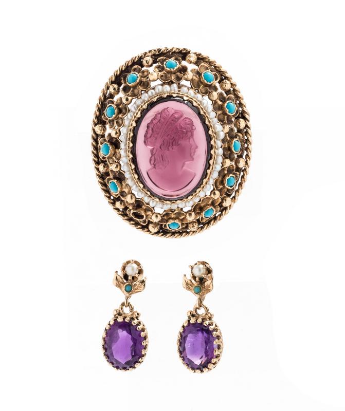 Consisting of a pendant/brooch containing one oval plastic plaque depicting the profile of a woman and numerous cabochon cut turquoise and seed pearls, together with a pair of 14 karat gold earrings containing two oval shape mixed cut amethyst, two cultured pearls and two cabochon cut turquoise.
