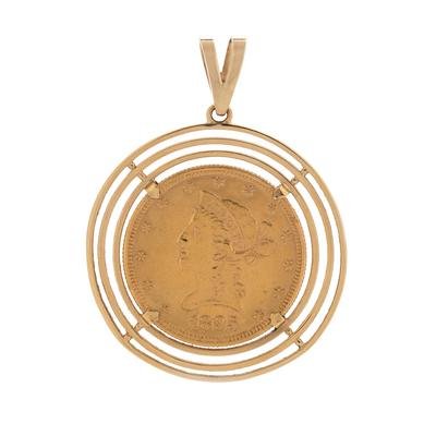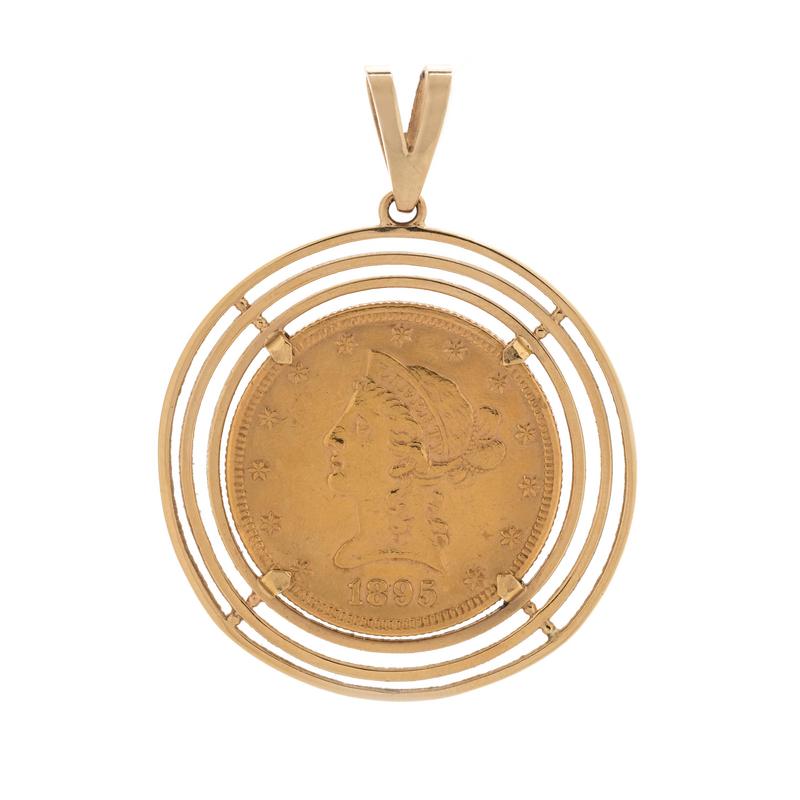 Containing one Liberty $10 coin, dated 1895, with a yellow gold wire surround.