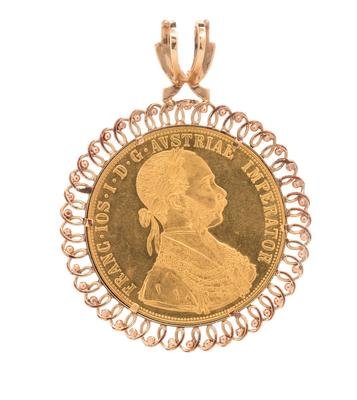 Containing one Austrian 4 Ducat coin, dated 1915, with yellow gold openwork surround.