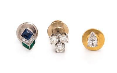 Consisting of a tie tac containing one pear shape diamond weighing approximately 0.48 carat, a tie tac containing three round brilliant cut diamonds weighing approximately 0.90 carat total, together with a tie tac containing one square step cut sapphire, four rhombus shape emeralds and four single cut diamonds. Mounted in platinum with white gold posts.