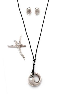 Consisting of a pair of 'Bean Design' earclips, an 'Eternal Circle' pendant/necklace, together with a 'Starfish' brooch.