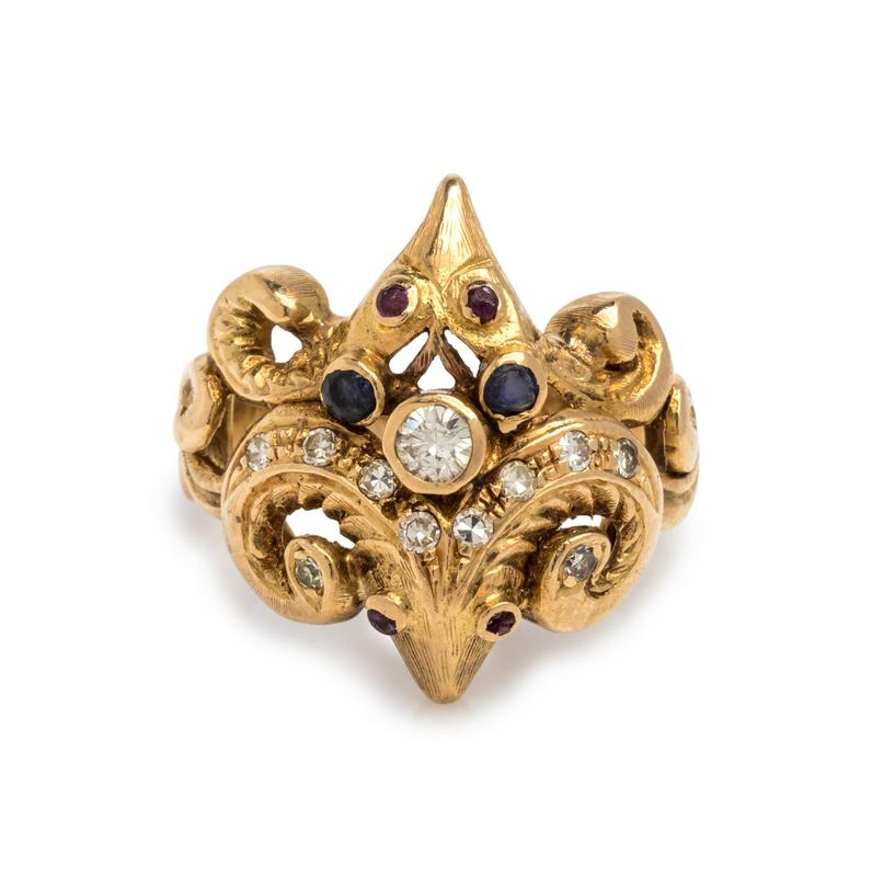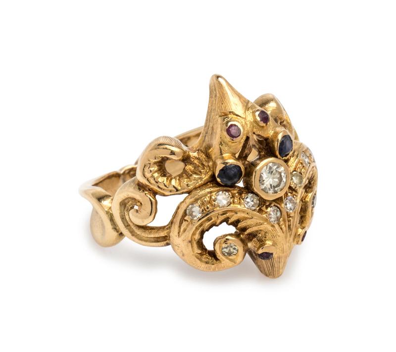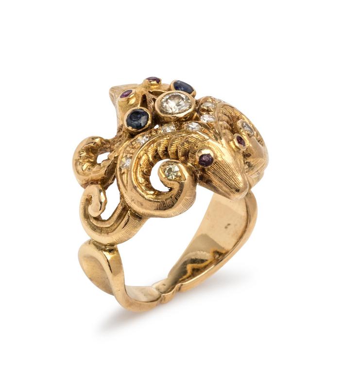 Consisting of a double ram's head design containing 11 round brilliant and single cut diamonds weighing approximately 0.20 carat total, two round mixed cut sapphires and four ruby eyes.