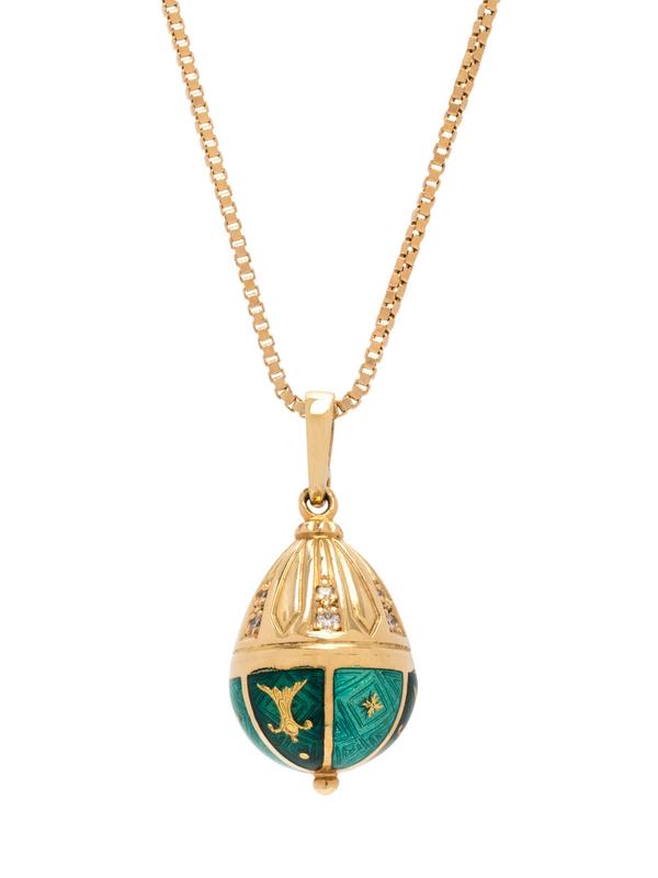 Consisting of an egg pendant containing 11 round brilliant cut diamonds weighing approximately 0.11 carat total, with green enamel detail, suspended from a box chain necklace.