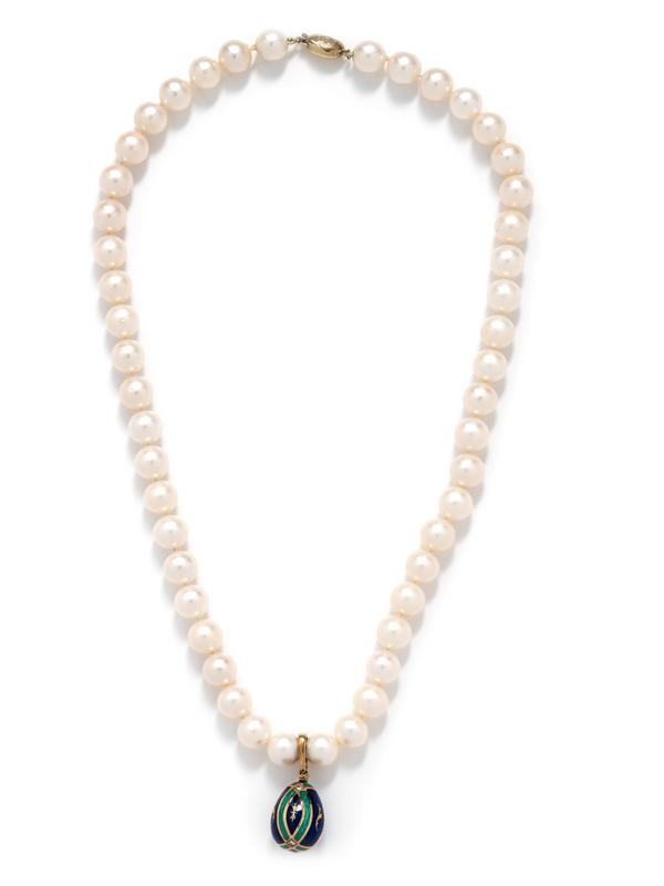 Consisting of a Fabergé egg pendant with blue and green enamel containing two round brilliant cut diamonds, suspended from a necklace containing pearls measuring approximately 9.70 mm in diameter, strung knotted with yellow gold box clasp.