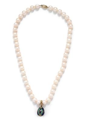 FABERGÉ, ENAMEL AND DIAMOND PENDANT AND CULTURED PEARL NECKLACE