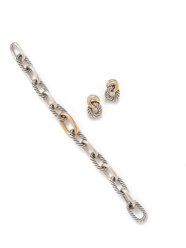 Consisting of a 'Madison' bracelet with polished and twisted silver links and one yellow gold link, together with a pair of 'Belmont' earrings with twisted silver and yellow gold.