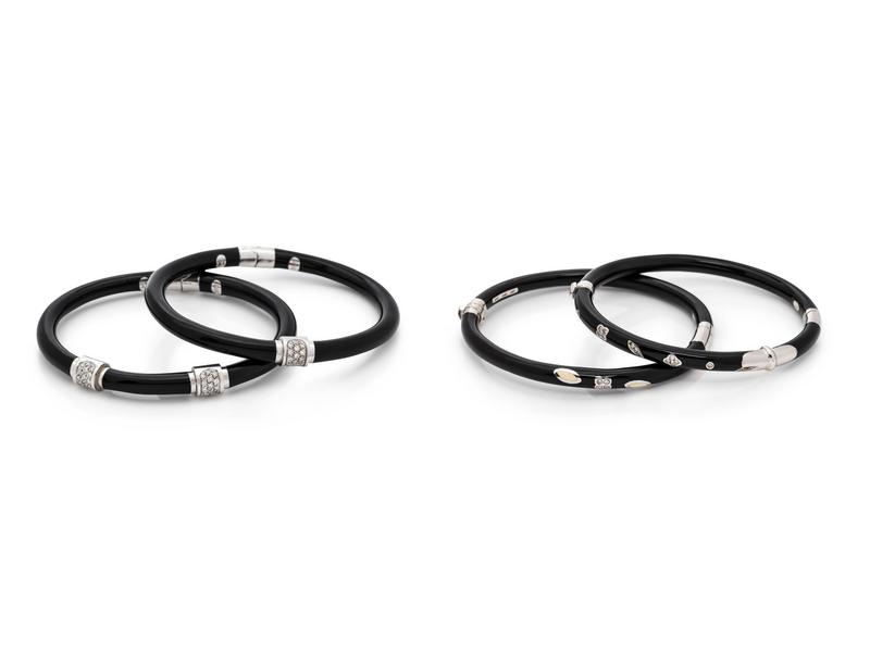 Consisting of two white gold and black enamel bangle bracelets by SOHO containing 48 round brilliant cut diamonds weighing approximately 0.48 carat total, hinged with magnetic clasps, together with two silver, white gold and black enamel bangle bracelets by Le Nouvelle Bague containing 20 round brilliant cut diamonds weighing approximately 0.20 carat total.