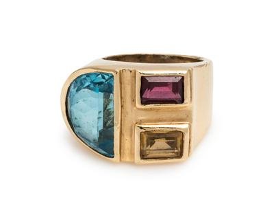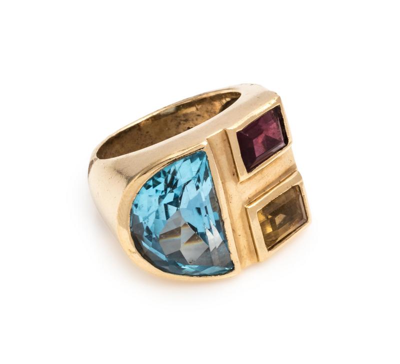 Containing one half-moon shape blue topaz, one rectangular step cut citrine and one rectangular step cut garnet.