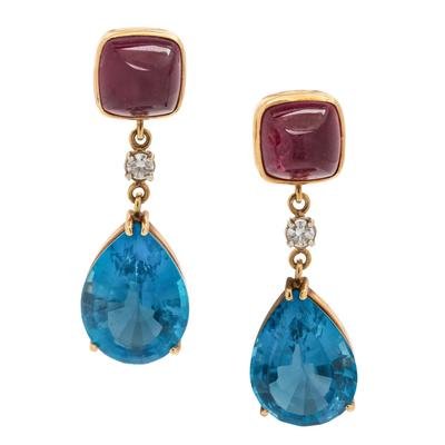 Containing two cushion shape sugarloaf pink tourmaline measuring approximately 9.50 x 9.50 mm, two pear shape mixed cut blue topaz measuring approximately 18.00 x 13.10 x 8.40 mm and two round brilliant cut diamonds weighing approximately 0.20 carat total, posts with clip backs. Mounted in yellow gold.