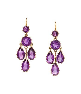 Containing four round mixed cut amethyst with six pear shape drops. Mounted in yellow gold.