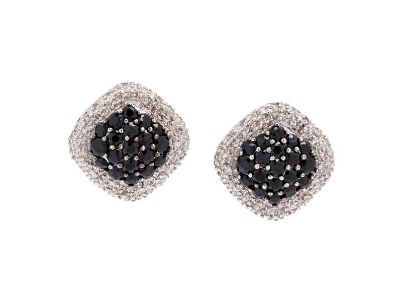Containing 38 round mixed cut sapphires measuring approximately 1.70-2.05 mm in diameter and 72 single cut diamonds weighing approximately 0.72 carat total, posts with clip backs. Mounted in white gold.