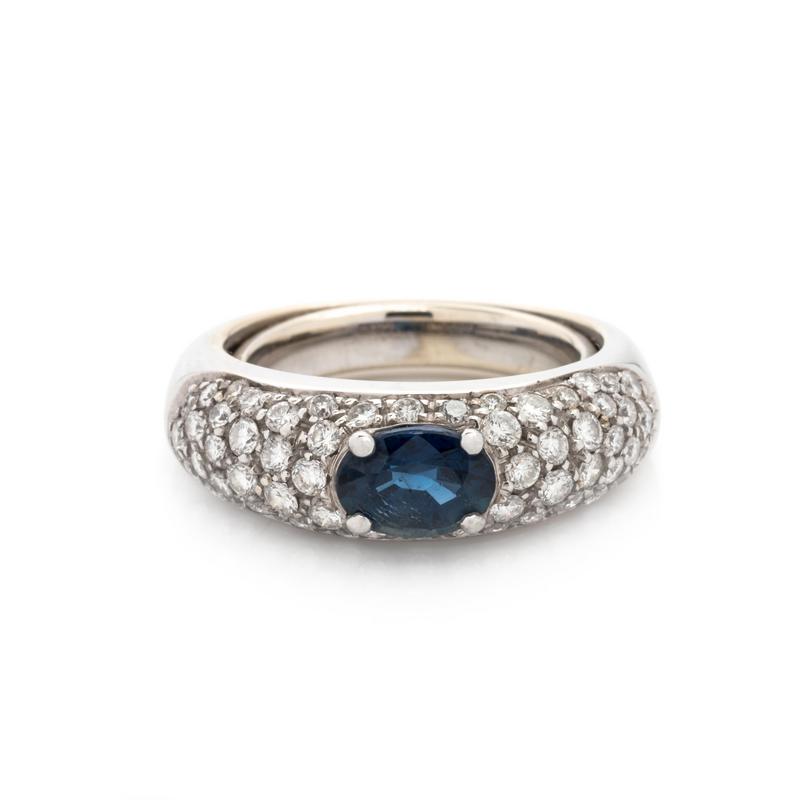 Containing one oval shape mixed cut sapphire measuring approximately 7.05 x 5.05 x 4.00 mm and 55 round brilliant cut diamonds weighing approximately 0.50 carat total. Mounted in white gold.
