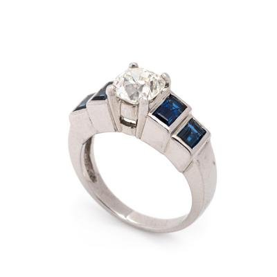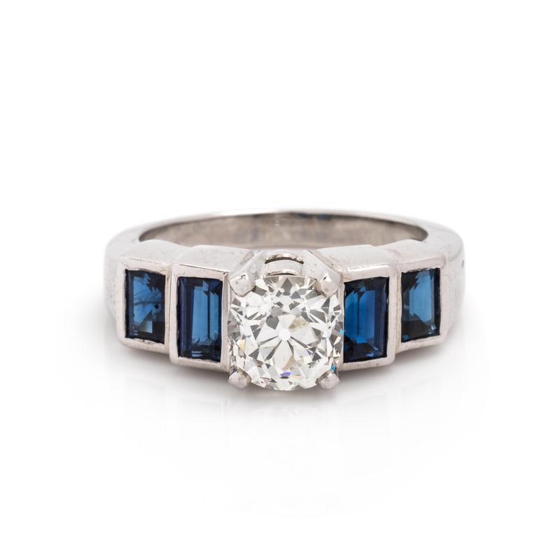 Containing one old mine cut diamond weighing approximately 1.25 carats and four rectangular step cut sapphires. Mounted in platinum.