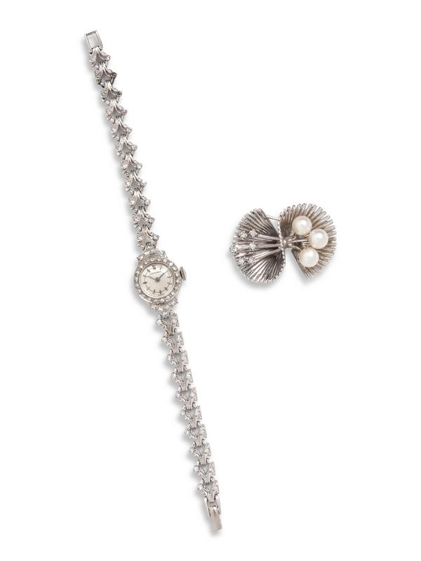 Consisting of a 14 karat white gold wristwatch, the bracelet, lugs and bezel containing numerous single cut diamonds weighing approximately 1.00 carat total, 15.00 mm case diameter, silvered matte dial signed LONGINES, bullet numerals, pencil hands, snap on case back, manual wind 17 jewel movement signed LONGINES WATCH CO., together with a swirl brooch containing three cultured pearls and six single cut diamonds.