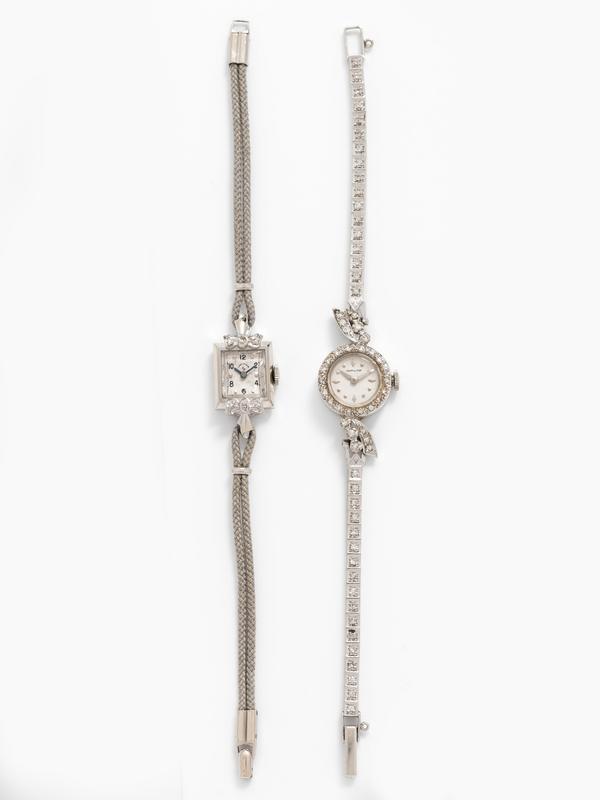 Consisting of a wristwatch with 18.00 mm case diameter, the bezel, lugs and bracelet containing numerous single cut diamonds, matte silvered dial signed HAMILTON, applied dot and lozenge numerals, white gold alpha hands, snap on case back, 22 jewel manual wind movement signed HAMILTON, fold over clasp with safety chain, together with a wristwatch with 18.00 x 14.00 mm case dimensions, the case with bow motifs containing six single cut diamonds, off white dial signed LADY ELGIN, applied square and black Arabic numerals, blued steel pencil hands, snap on case back, 19 jewel manual wind movement signed ELGIN, nylon strap, fold over clasp.