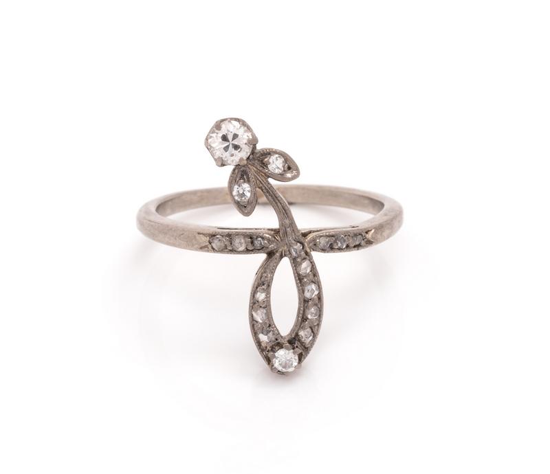 Containing one round brilliant cut diamond weighing approximately 0.10 carat and 17 round brilliant, single and mixed cut diamonds. Mounted in white gold.