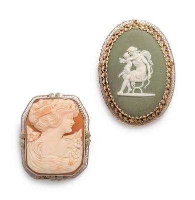 Consisting of a carved shell cameo depicting the profile of a woman with white gold filigree surround, together with a pendant/brooch containing one oval shape Wedgwood plaque depicting Venus and Cupid, with yellow gold filigree surround.