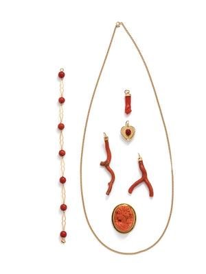 Consisting of a yellow gold curb link chain necklace, a yellow gold brooch containing one oval shape carved coral depicting the profile of a woman, two freeform coral pendants with yellow gold mounts, a carved coral figa pendant with yellow gold mounting, a yellow gold heart charm containing two oval shape cabochon cut coral, together with a bracelet with yellow gold open links and seven round coral beads.