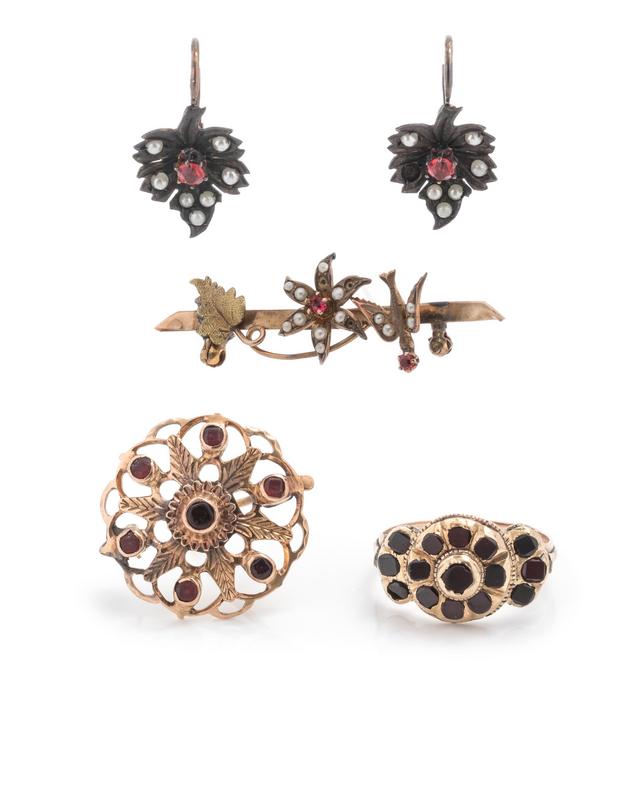 Consisting of a bar brooch with flower, leaf and bird motifs with seed pearls and gemstones, a pair of leaf motif earrings containing two gemstones and 13 seed pearls, a ring containing 21 round glass, together with an open work brooch containing seven round glass.