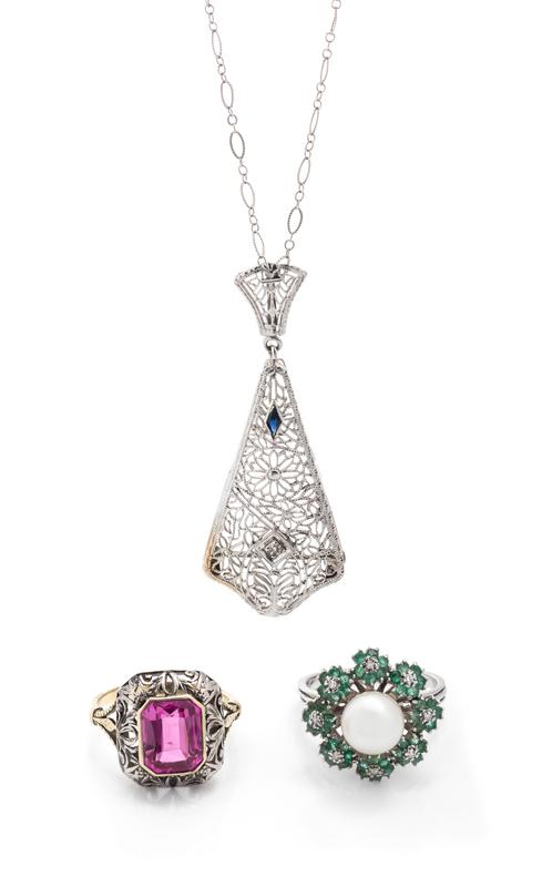 Consisting of a bicolor gold ring containing one mixed cut synthetic pink sapphire, an 18 karat white gold ring containing one cultured pearl, eight single cut diamonds and 48 round mixed cut emeralds, together with an openwork 14 karat white gold pendant/brooch containing one diamond and one lozenge shape synthetic sapphire, suspended from a white gold plated fancy link necklace.