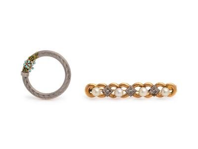 Consisting of a bar brooch containing four pearls measuring approximately 4.20 mm in diameter and three single cut diamonds, together with a circle brooch with enamel flowers by Krementz.