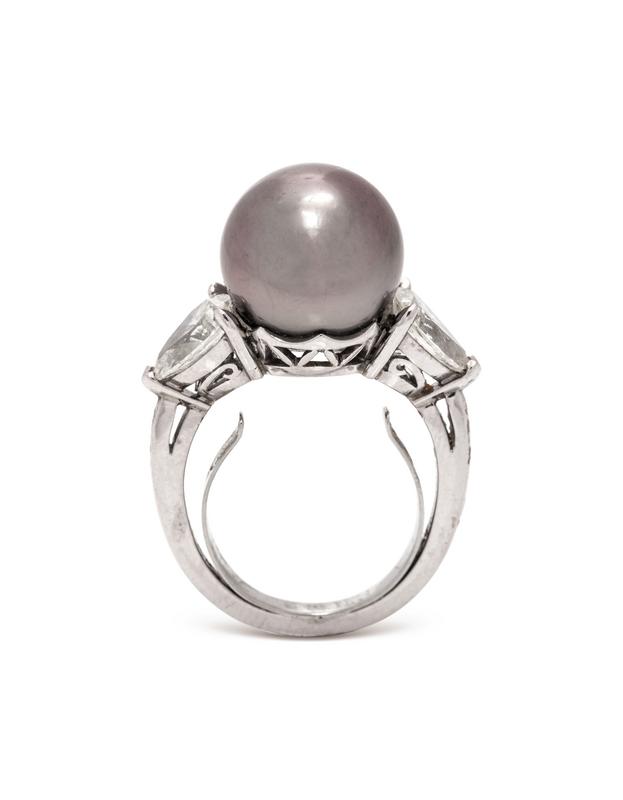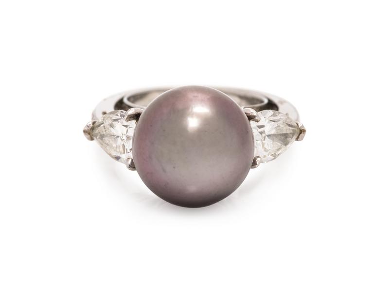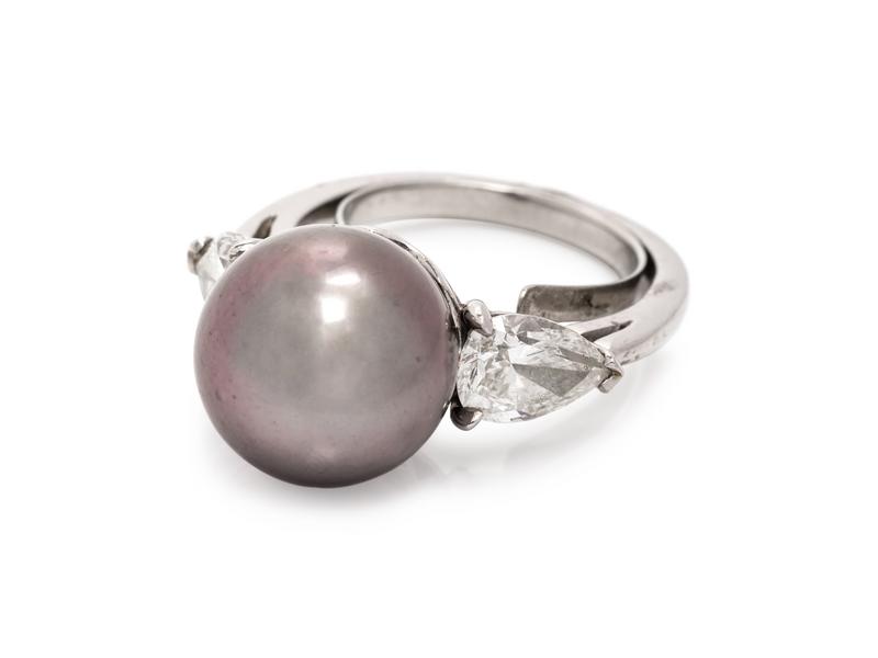Containing one Tahitian pearl measuring approximately 12.05 mm in diameter and two pear shape diamonds weighing approximately 1.70 carats total. Mounted in platinum.