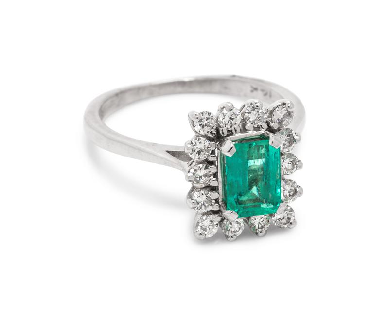 Containing one emerald cut emerald measuring approximately 7.20 x 5.20 mm and 14 round brilliant cut diamonds weighing approximately 0.25 carat total. Mounted in white gold.