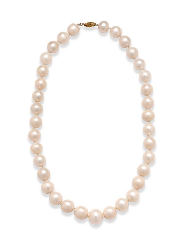 Containing 35 pearls measuring approximately 12.00-14.80 mm, strung knotted in a graduating style with a yellow gold clasp.