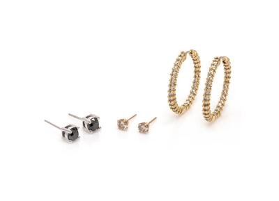 Consisting of a pair of yellow gold hoop earrings containing numerous round brilliant cut diamonds, a pair of yellow gold stud earrings containing two round brilliant cut diamonds weighing approximately 0.25 carat total, together with a pair of white gold stud earrings containing two round brilliant cut black diamonds weighing approximately 0.59 carat total.