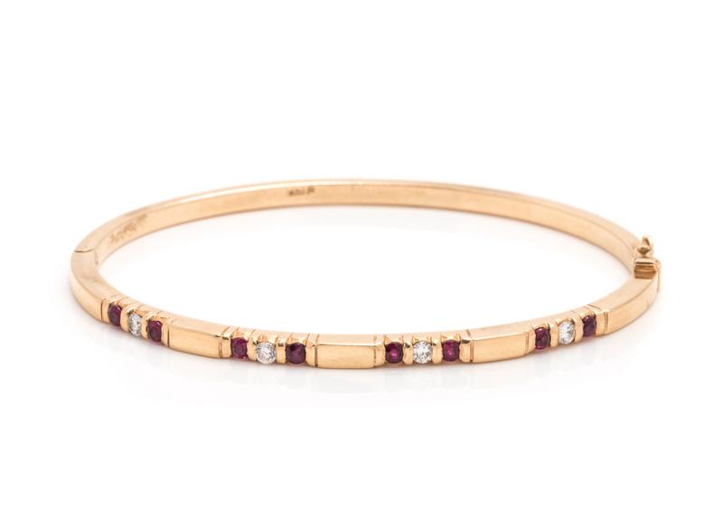 Containing four round brilliant cut diamonds weighing approximately 0.20 carat total and eight round mixed cut rubies measuring approximately 2.20 mm in diameter, hinged with side clasp.